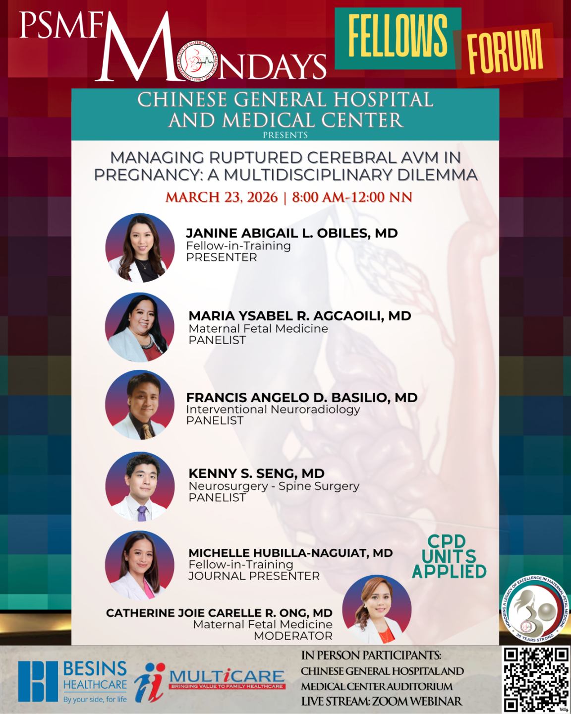 The Fellows’ Forum is a scientific meeting envisioned to be a venue for academic interchange among subspecialists and related fields constituting the multidisciplinary team involved in the care of women with high risk pregnancies. The forum will be held regularly on a monthly interval , 5 times a year, from January to October. It will be hosted by institutions with an accredited Maternal-Fetal Medicine fellowship training program on a rotation basis. The host institution will present a case or case series admitted in its hospital.